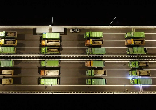 2020年5月27日晚,參與荷載試驗的重型卡車排列在滬通長江大橋上。